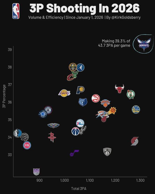 今天NBA官方公布最新一期的常规赛MVP榜单,前三名依然是亚历山大、约基奇和坎宁安。文班亚马第四,杰伦-布朗升至第五,东契奇跌至第六。下面这张图是进入2026年之后联盟各队三分表现:纵轴三分命中率、横轴三分出手数。